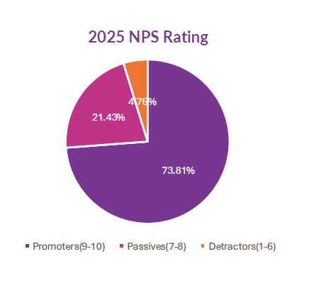 The 2025 NPS results show that nearly three-quarters of respondents (73.81%) were Promoters, rating their likelihood to recommend Hiko as a 9 or 10. While 21.43% were Passives, only 4.76% were Detractors, highlighting minimal dissatisfaction across the customer base and a high level of trust and advocacy.